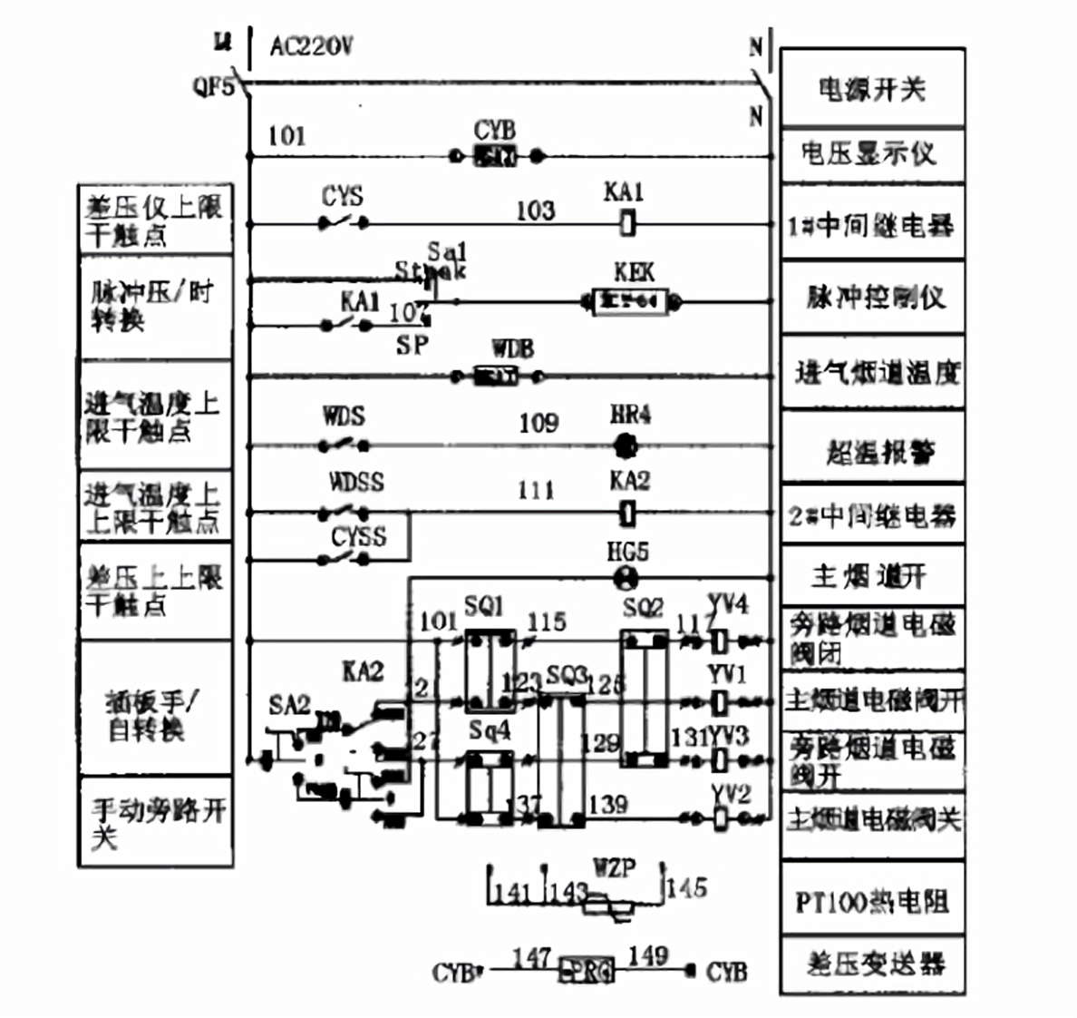 (2)插板閥設(shè)有自動/手動轉(zhuǎn)換開關(guān),打向自動檔時,受溫度表控制。當煙溫升至160時報警。當溫度180時,KA2工作旁路煙道閥門氣缸的電磁閥打開,當旁路煙道完全打開時,氣缸停止運動,同時打開主煙道閥門氣缸的電磁閥氣缸進氣,當閥門達到全關(guān)位置,電磁閥自動關(guān)閉,氣缸停止運動。當煙氣溫度<140時,溫度變送器把檢測到的信號發(fā)出,系統(tǒng)先啟動主煙道閥門氣缸的電磁閥,使氣缸進氣,閥門達到全開位置,同時系統(tǒng)打開旁路煙道氣缸電磁閥氣缸進氣。當氣缸將閥全關(guān)閉后氣缸停止運動,完成除塵器的離線與在線切換工作。